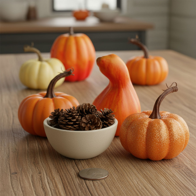 Creează un decor de toamnă cald și primitor cu acești dovleci decorativi disponibili în 6 modele diferite. Realizați din plastic și polistiren, aceștia impresionează prin detaliile realiste și varietatea de culori – portocaliu, roșu și alb. Pot fi utilizați ca piese de sine stătătoare pe masă, integrați în coronițe sau combinați în aranjamente creative. Suprafața poate fi mată sau cu efect strălucitor, adăugând un plus de diversitate și eleganță. Ușori și rezistenți, își păstrează frumusețea ani la rând.