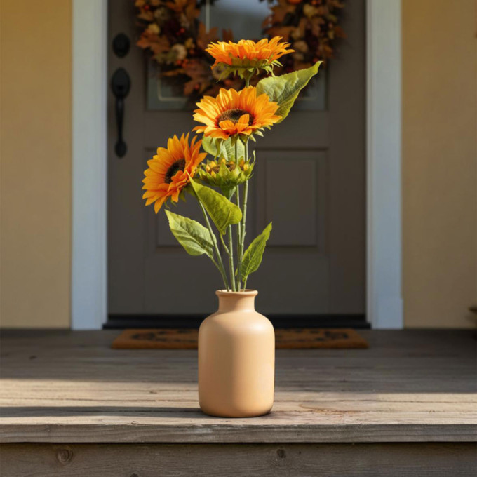 Adaugă un strop de lumină și veselie decorului tău cu această floare decorativă de floarea-soarelui în nuanțe citrin. Cu o tulpină de 90 cm și trei flori bogate, această decorațiune aduce frumusețea naturală a verii târzii și a toamnei direct în casa ta. Ideală pentru vaze înalte, aranjamente florale sau ca element de accent pe masă ori în colțuri speciale ale locuinței, floarea-soarelui decorativă este realizată din materiale rezistente, care își păstrează aspectul viu-colorat și detaliile realiste mult timp.