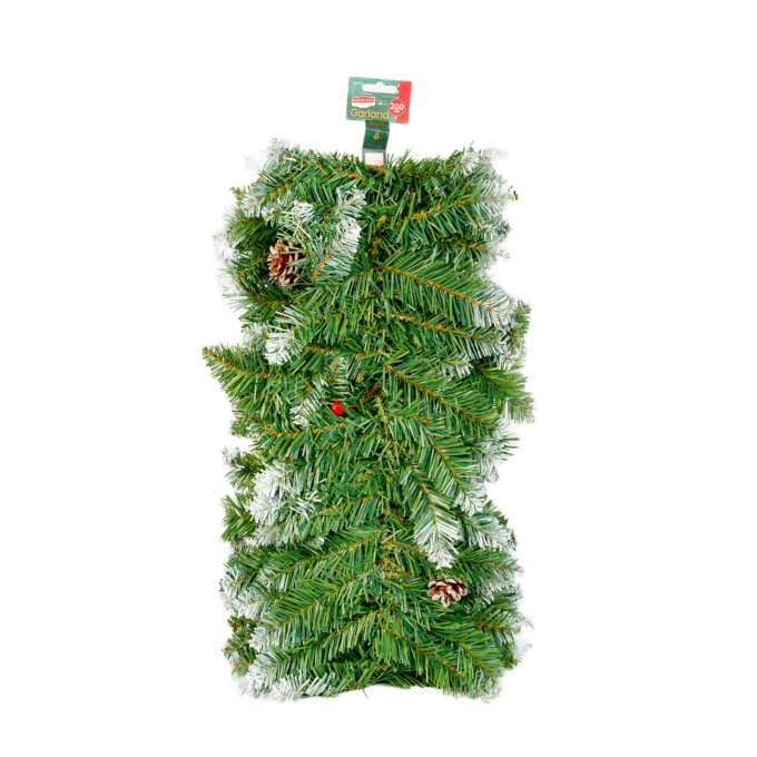Ghirlandă de brad artificial – verde, cu efect de zăpadă, cu conuri și bobițe roșii – 200 cm – PVC