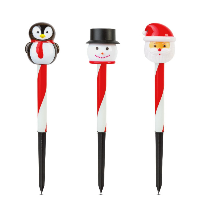 Împodobește-ți grădina sau intrarea în casă cu aceste lămpi solare de Crăciun, disponibile în trei variante vesele: Moș Crăciun, om de zăpadă și pinguin. Figurinele festive luminează cu LED alb rece și aduc un plus de farmec în serile de iarnă.