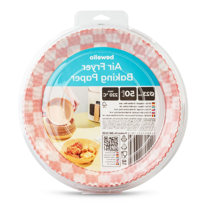 Această hârtie de coacere special concepută pentru air fryer, cu un diametru de 23 cm, formă rotundă și model în carouri, oferă o soluție practică pentru preparare. Fabricată din hârtie de 40 gsm, rezistentă la temperaturi de până la 220°C, previne lipirea și arderea alimentelor de coșul de gătit, păstrând gustul intact și reducând pierderile de mâncare. Este ideală pentru utilizare în air fryer, cuptor electric, microunde sau aparat de gătit cu aburi, fiind de unică folosință și livrată în pachete de 50 de bucăți. De asemenea, facilitează curățarea coșului, prelungindu-i durata de viață.