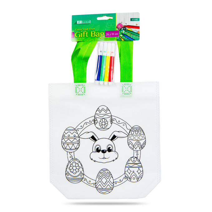 Această geantă cadou colorabilă, cu dimensiunile de 24 x 22 cm, este ideală pentru copii și include 4 markere colorate. Fabricată din material PET (nețesut), oferă 4 modele cu temă de Paște, combinând utilitatea unei genți cu o activitate creativă. Pentru colorare, se recomandă introducerea unui carton gros între cele două straturi ale genții pentru a preveni scurgerea culorilor. Perfectă pentru decorarea locuinței în perioada Paștelui.