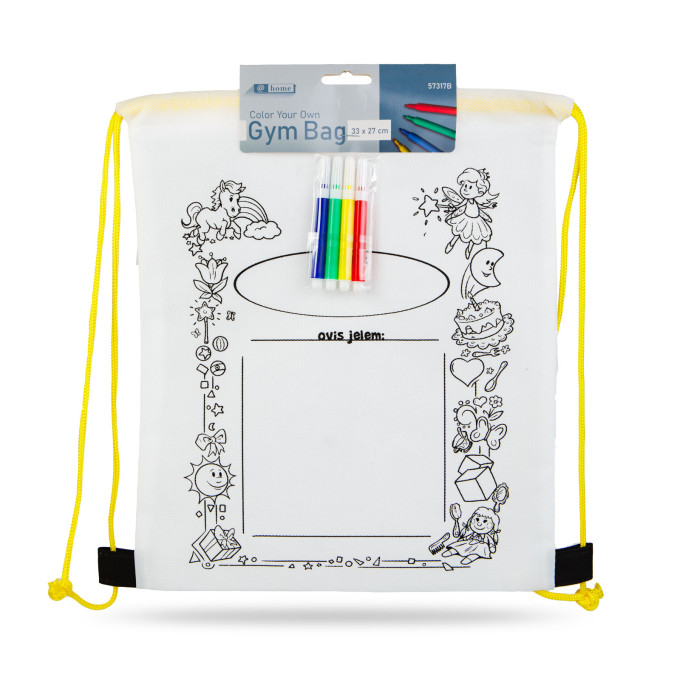Acest sac de sport colorabil, cu dimensiunile de 33 x 27 cm, este ideal pentru copii și include 4 markere colorate. Fabricat din material PET (nețesut), combină funcționalitatea unui sac de gimnastică sau rucsac cu o activitate creativă. Pentru colorare, se recomandă introducerea unui carton gros între cele două straturi ale sacului pentru a preveni scurgerea culorilor. Perfect pentru școală, decor sau cadouri.