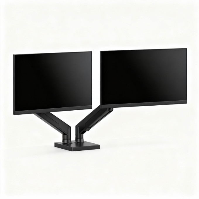 Datorită brațelor duble și telescopice, ambele monitoare pot fi reglate independent, permițând o poziționare optimă pentru confort vizual și eficiență maximă. Construcția robustă din aluminiu și oțel asigură durabilitate și siguranță, iar prinderea de tip clemă economisește spațiu pe suprafața biroului.