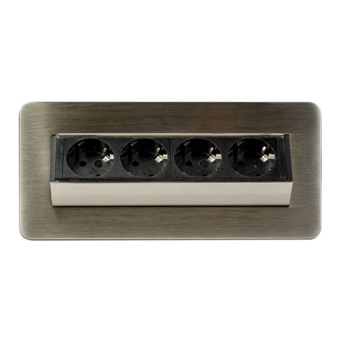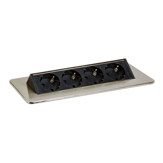 Dispune de 4 prize dotate cu protecție pentru copii, într-un corp rezistent realizat din metal și plastic de calitate. Sistemul de deschidere „flip-up” cu arc permite acces rapid la prize printr-o simplă apăsare, iar închiderea completă conferă un aspect ordonat și minimalist suprafeței de lucru.