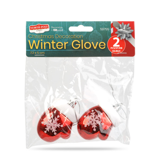 Setul conține două mănuși decorative confecționate din plastic rezistent, prevăzute cu agățătoare argintie pentru o montare rapidă și sigură. Pot fi folosite pentru decorarea bradului, a coronițelor sau a compozițiilor de sezon. Combinația de roșu intens și alb sclipitor creează un efect vizual plin de căldură și stil.