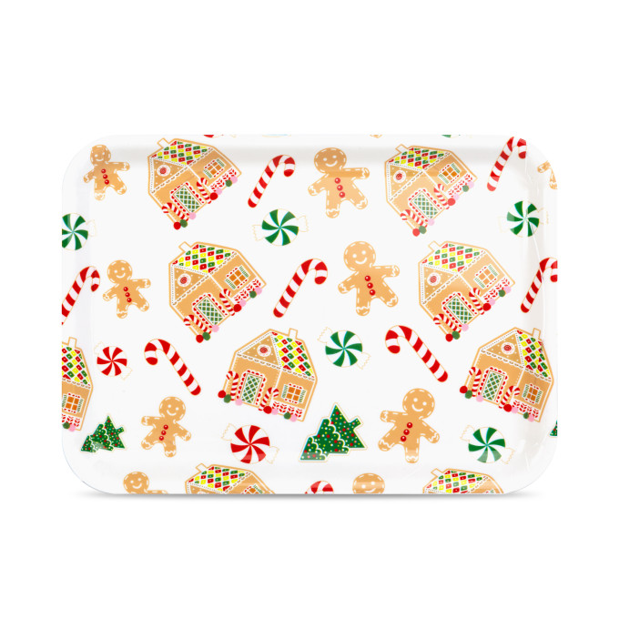 Adaugă un strop de culoare și bucurie mesei tale cu această tăviță decorativă din plastic, decorată cu motive vesele și colorate. Designul include căsuțe de turtă dulce, brăduți și bastonașe de zahăr, creând o atmosferă caldă și plină de veselie. Ideală pentru servirea prăjiturilor, dulciurilor, fructelor sau gustărilor preferate.