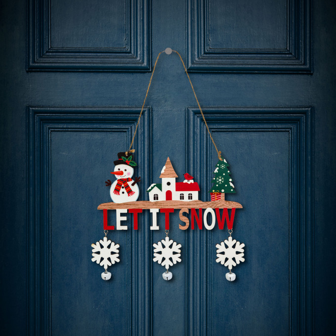 Adaugă o notă caldă și rustică decorului tău festiv cu această decorațiune din lemn, prevăzută cu clopoței și detalii de sezon. Disponibilă în două modele diferite — unul cu ren și inscripția „Christmas”, iar celălalt cu om de zăpadă și textul „Let It Snow” — această piesă aduce farmecul iernii în orice încăpere.