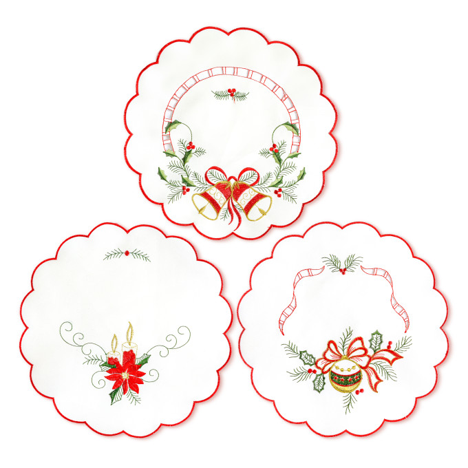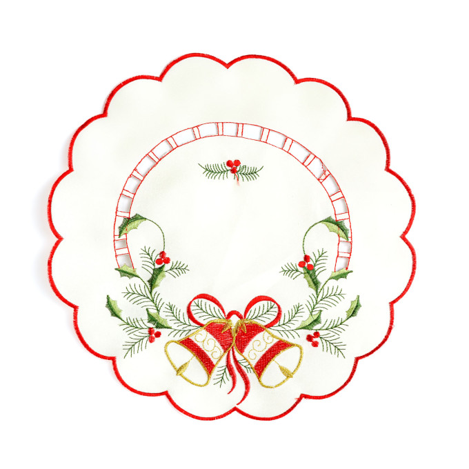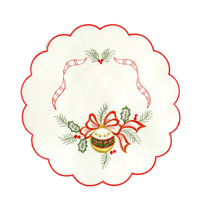 Această față de masă brodată, cu design clasic și detalii elegante, este alegerea perfectă pentru a aduce o notă festivă și rafinată mesei tale. Forma rotundă, marginile roșii și modelele brodate cu motive precum clopoței, lumânări, globuri și crenguțe de vâsc creează o atmosferă caldă și plină de farmec.