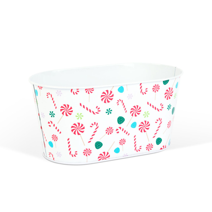 Acest coș decorativ din metal, cu imprimeu vesel de bastonașe dulci, este alegerea ideală pentru decorul festiv al casei tale! Poate fi folosit pentru depozitarea prăjiturilor, a bomboanelor, a decorațiunilor sau a micilor cadouri. Designul elegant și culorile vii aduc un aer jucăuș și plin de farmec oricărui spațiu.