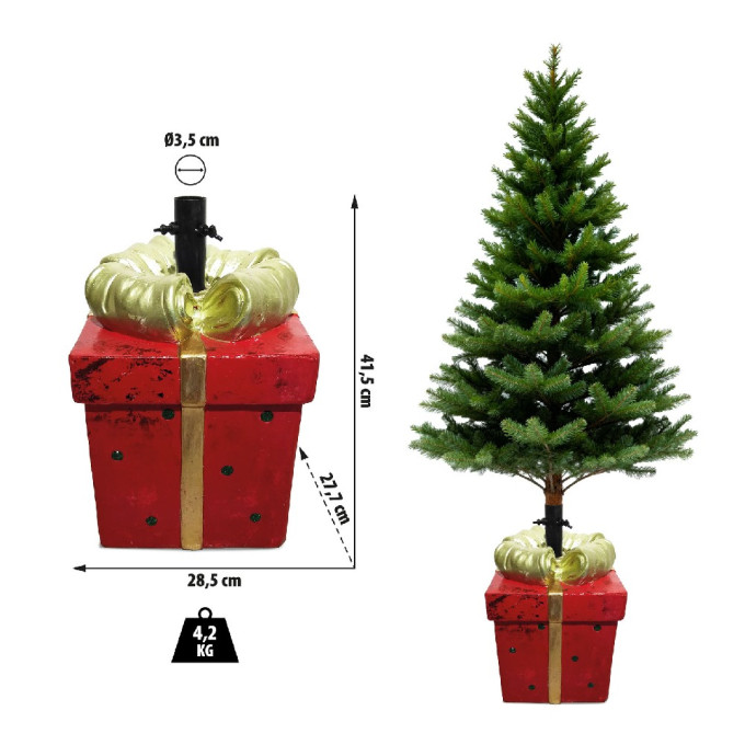 Acest suport de brad în formă de pachet cadou nu este doar practic, ci și un element decorativ impresionant pentru pomul de Crăciun. Culoarea roșie cu fundă aurie creează o impresie realistă de cadou, asigurând în același timp stabilitate pentru pom. Fabricat din piatră artificială, oferă o prindere solidă chiar și pentru brazi de dimensiuni mari.